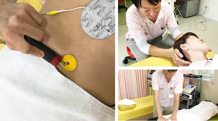「物理療法」:ハイボルテージや高周波という特殊な電気施術機器を使用しています。プロのスポーツ選手でも使用される器械で、主に筋肉の柔軟性獲得・関節の可動性の増大があります。